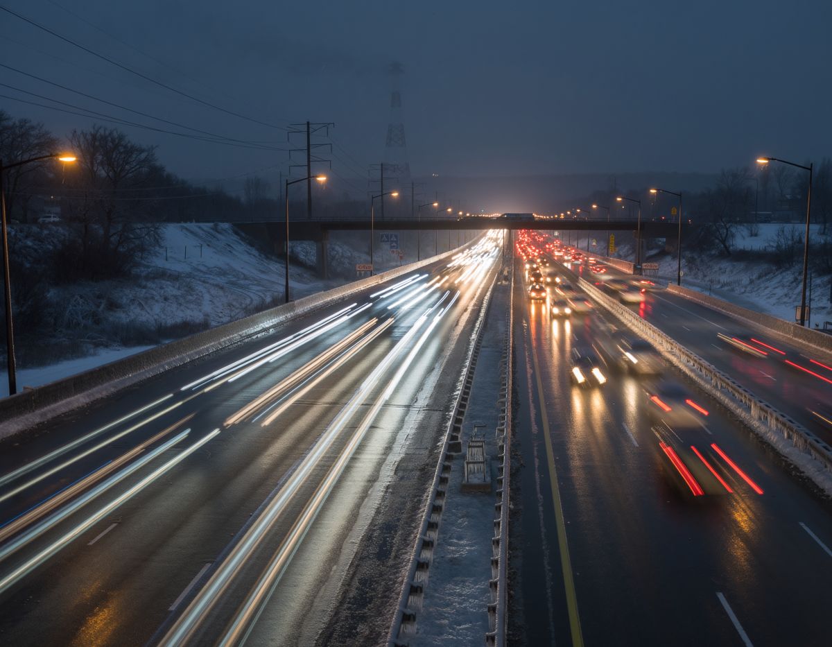 Watch for: bridge icing, sudden visibility drops, traffic speed changes.